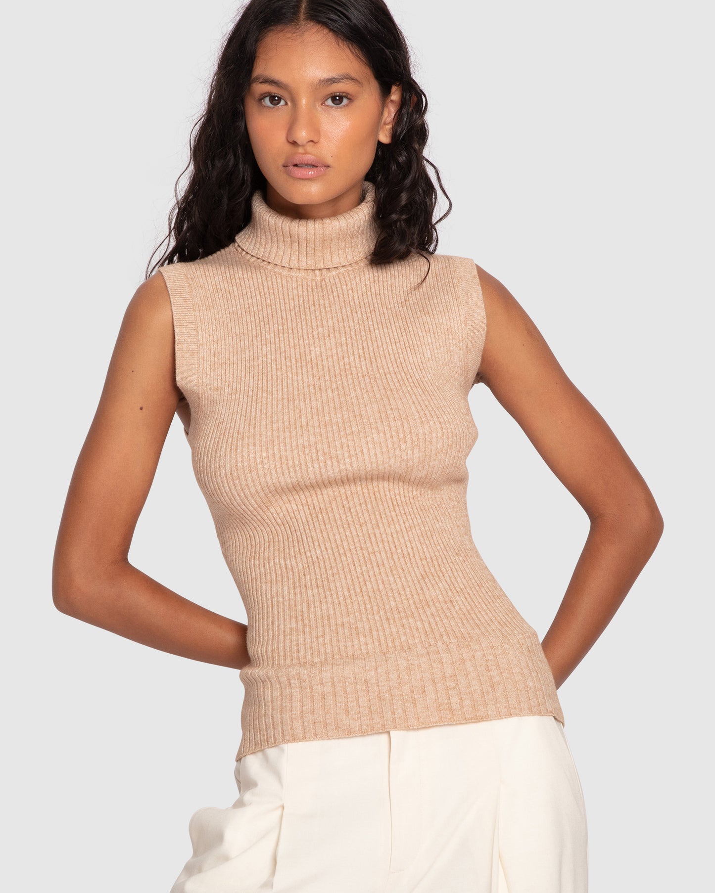 The Equation Sleeveless Turtleneck Knit is a refined essential that blends sophistication with modern ease. Designed for a sleek, form-fitting silhouette, this top features a ribbed texture that enhances its flattering shape. The high roll-neck adds a touch of elegance, while the sleeveless cut makes it a versatile layering piece. Crafted from a soft viscose-blend, it delivers comfort with a luxurious fee - perfect for effortless styling from day to night.