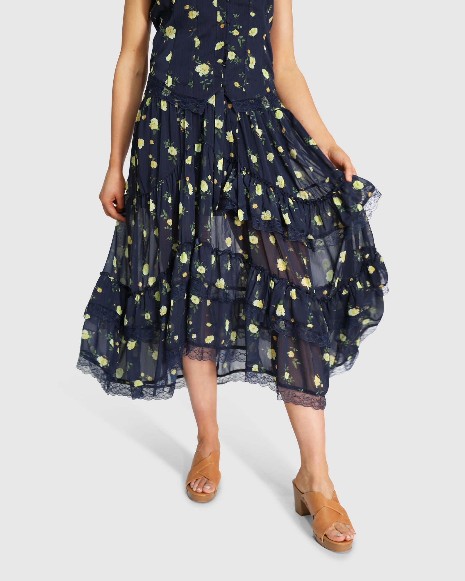 Wanderlace Ruffle Maxi Skirt - Navy Print