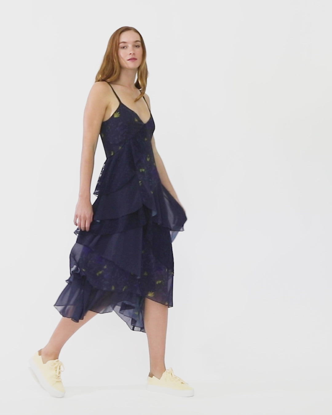 Romantic and whimsical, the Charmed Floral Print Ruffle Midi Dress brings movement and elegance to any occasion. Crafted from lightweight material, it features a cascading ruffle design, delicate lace accents, and a soft floral print for a dreamy finish. Adjustable straps and an asymmetrical hem make it effortlessly flattering and easy to wear.