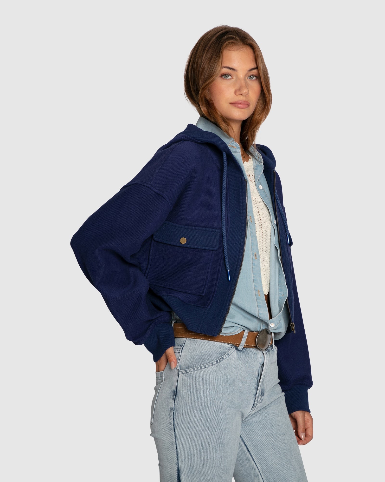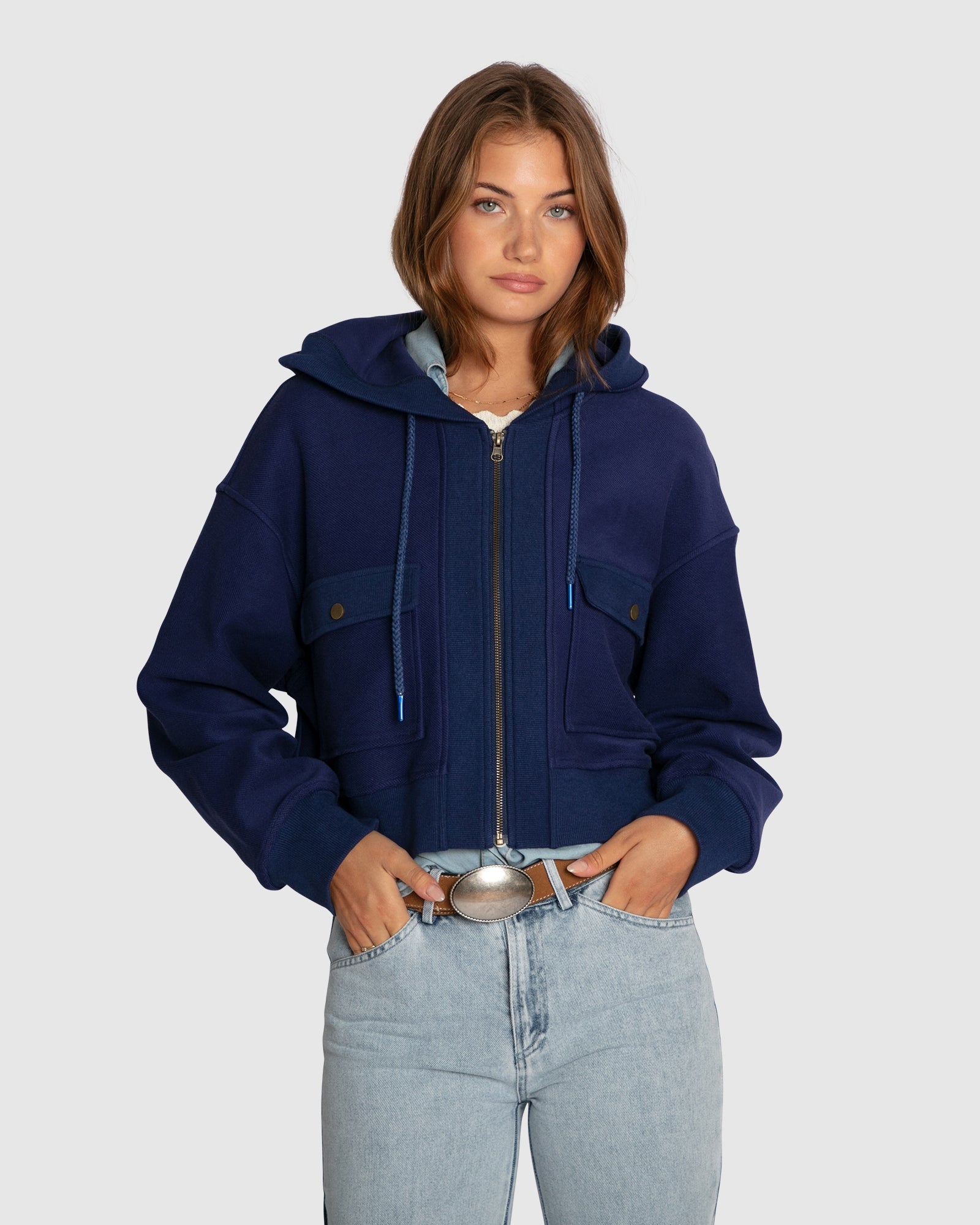 Bring a touch of utility chic to your everyday wardrobe with the Fireside Cropped Utility Zip Jacket. Made from soft cotton, this oversized textured knit features flap pockets, hood with drawcords, and ribbed trims for a laid-back look. Whether you're layering it over a casual mini or denim, this jacket adds effortless style to any outfit.