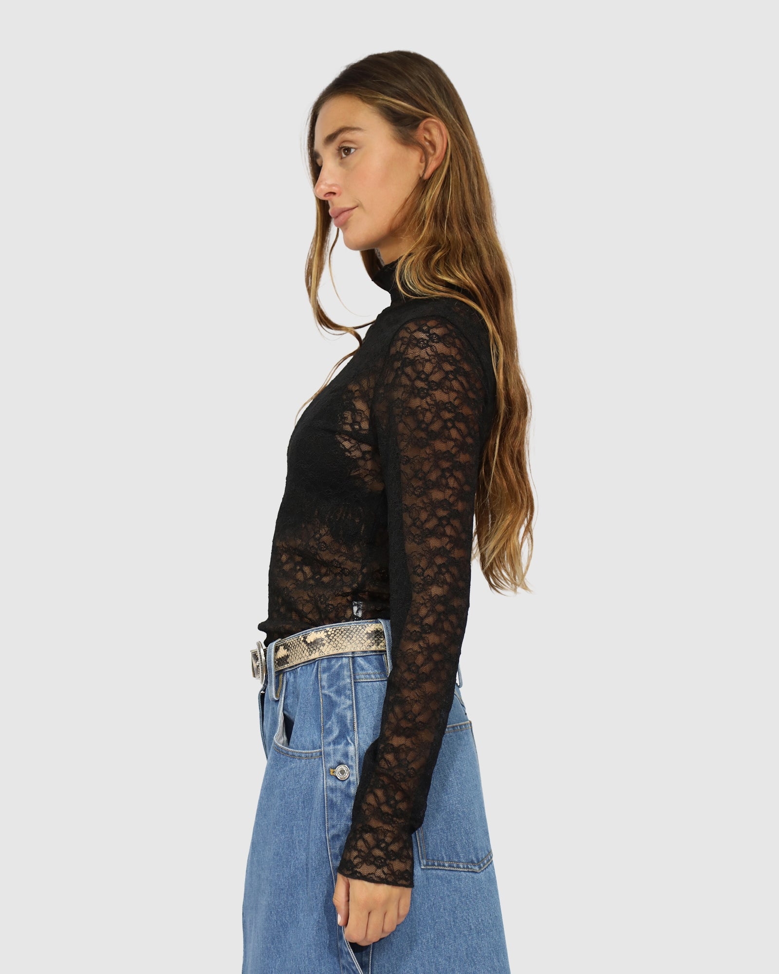 The Fairy Girl Lace Top is a delicate, feminine layering piece designed in a sheer stretch lace, with a polo neck and long sleeves.