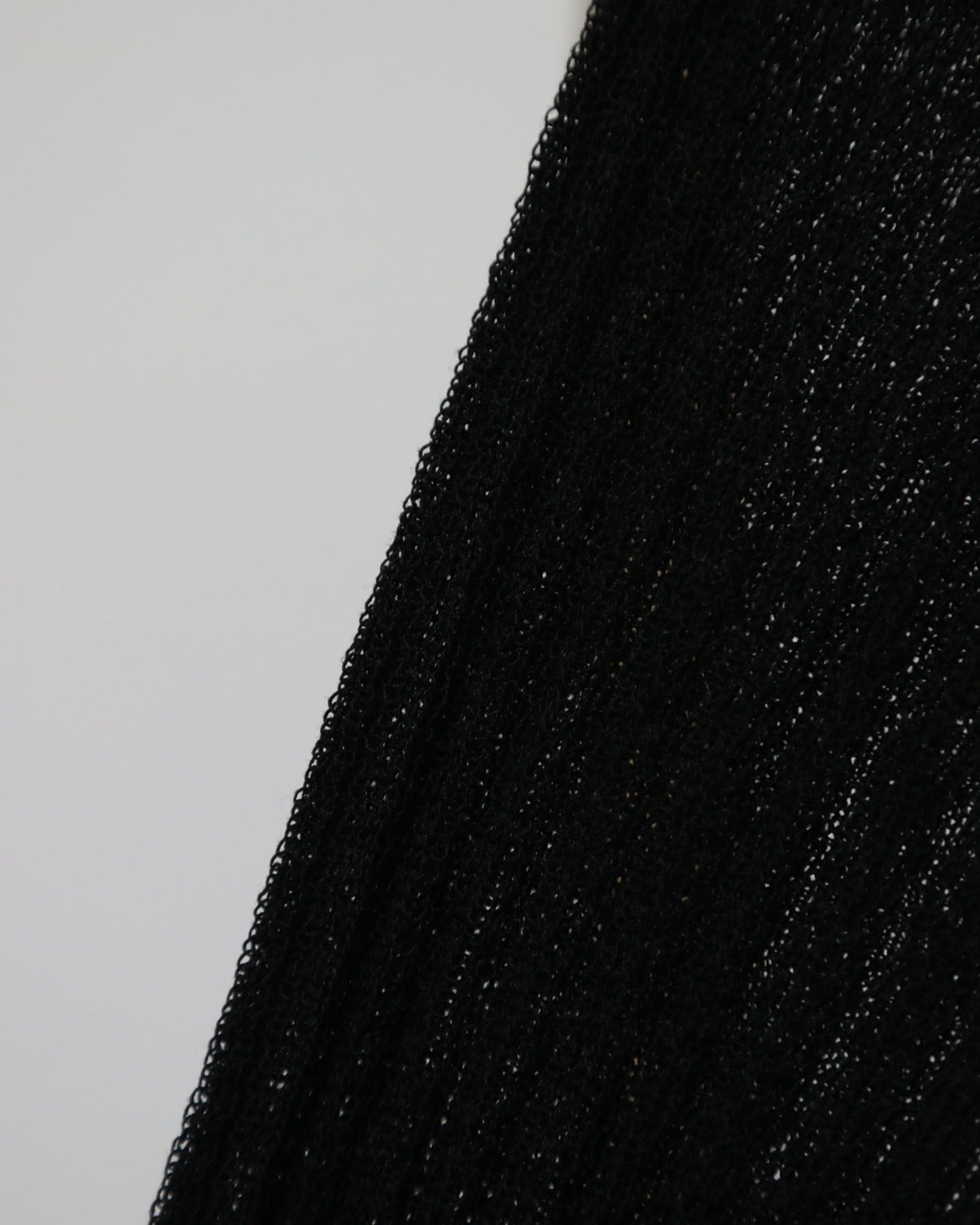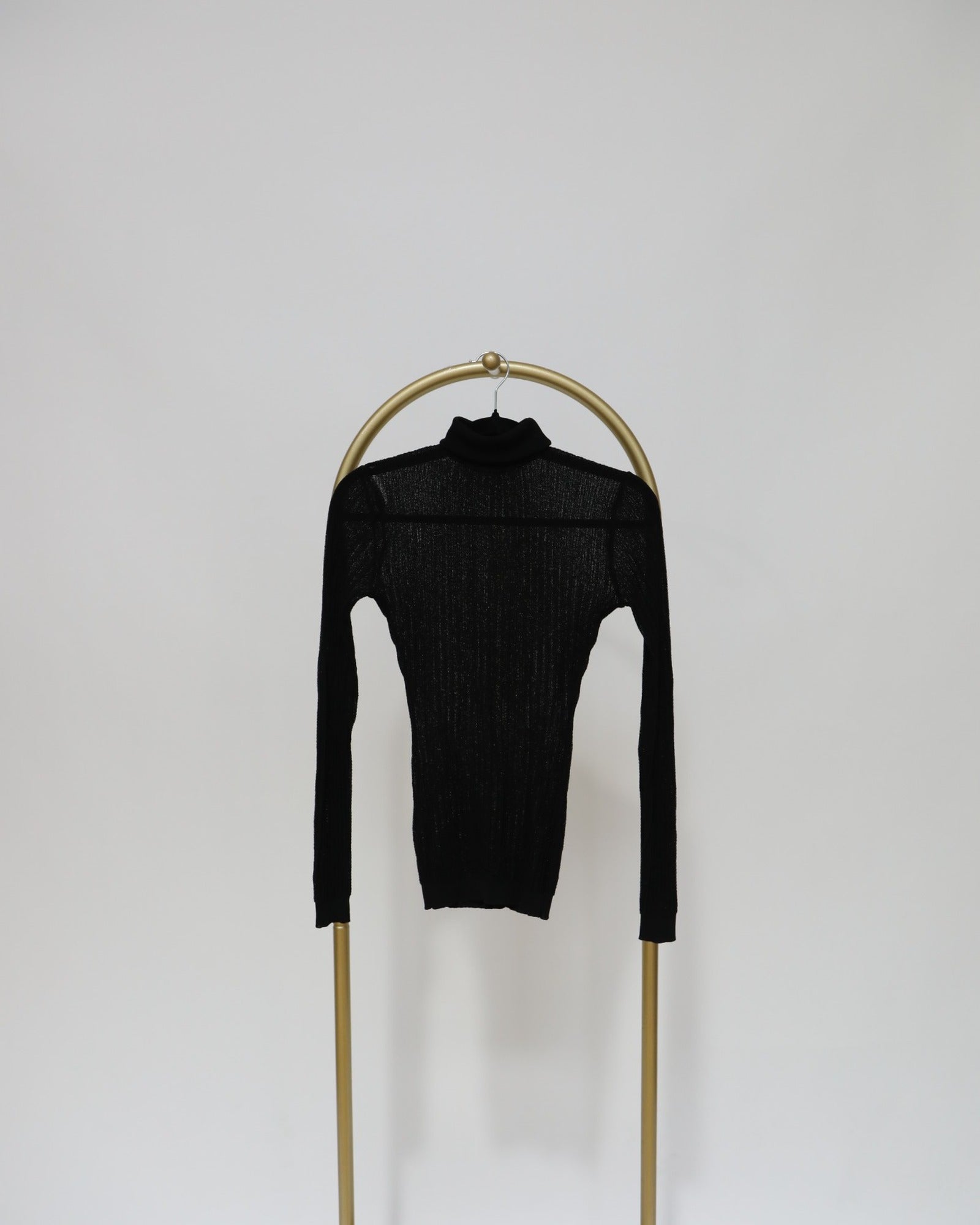A refined layering essential, this sheer black knit top is designed with a slim silhouette and delicate vertical texture throughout. Featuring a soft high neckline and long sleeves, it offers a lightweight feel with just the right amount of transparency - perfect for styling under blazers or worn on its own for an understated evening look.