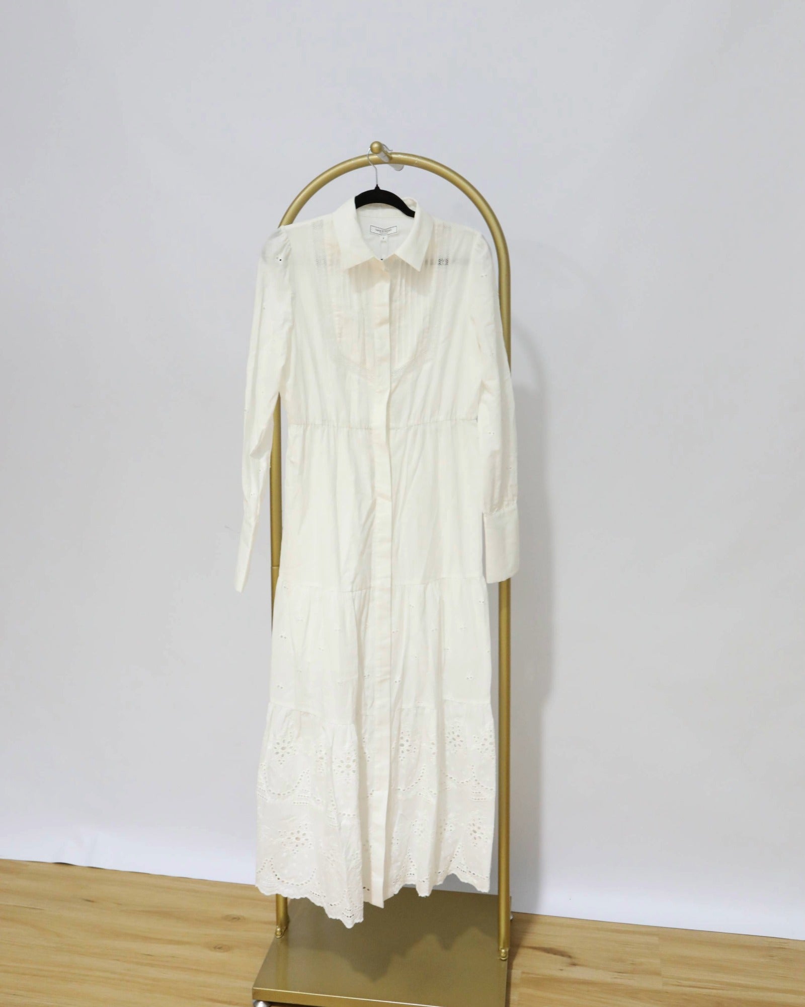 A crisp white midi dress featuring a classic collared neckline, button-through front and long sleeves with cuffed hems. Designed with a gently cinched waist and tiered skirt, finished with broderie anglaise detailing at the hem for added texture. A versatile, easy-wear style suited to everyday dressing or relaxed occasions.