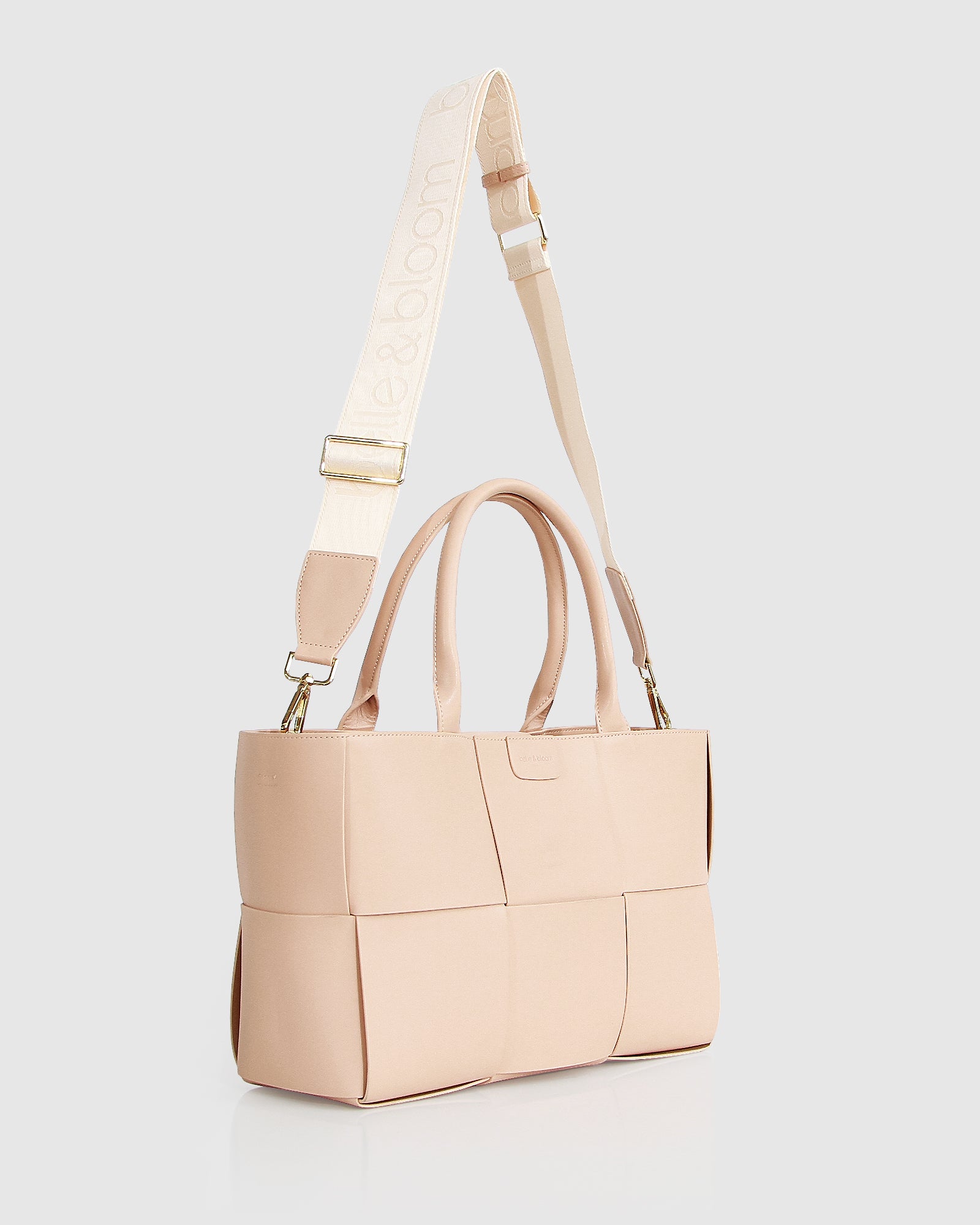 Large woven leather panels add major texture to the Long Way Home Woven Tote. Featuring a removable internal zip-up bag and a custom cream weft strap, this bag has everything you need for a busy day in or out of the office.