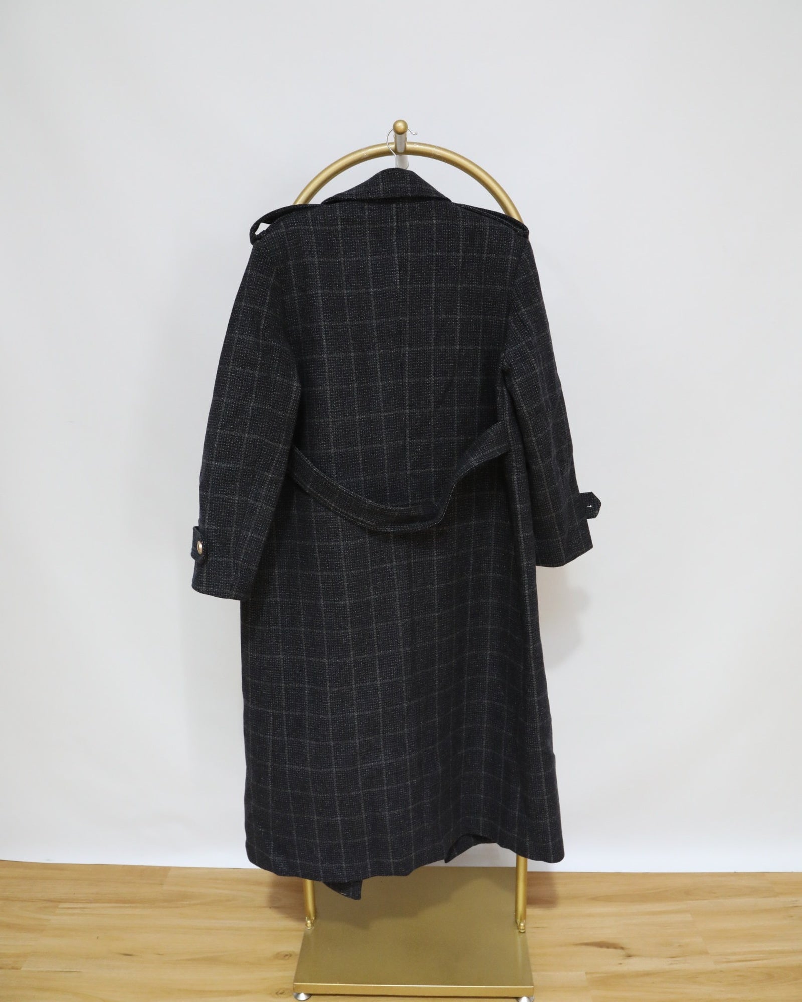A timeless outerwear staple with tailored polish, this longline check coat is designed to elevate everyday dressing. Cut in a classic double-breasted silhouette, it features a structured lapel, statement gold-tone buttons and a softly defined waist with a removable tie belt. Finished with a subtle check pattern and full lining, it layers effortlessly over denim or knitwear for refined cold-weather styling.