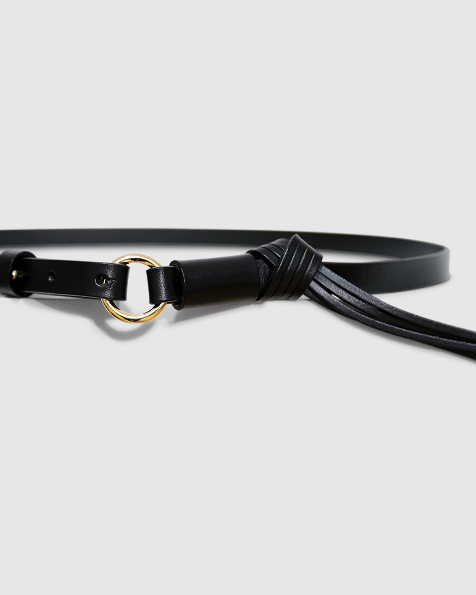 Sleek, minimal, and with just the right amount of flair. This slim leather belt features a polished gold ring closure and a knotted tassel detail that adds movement and edge. A versatile piece to elevate both casual and refined looks.