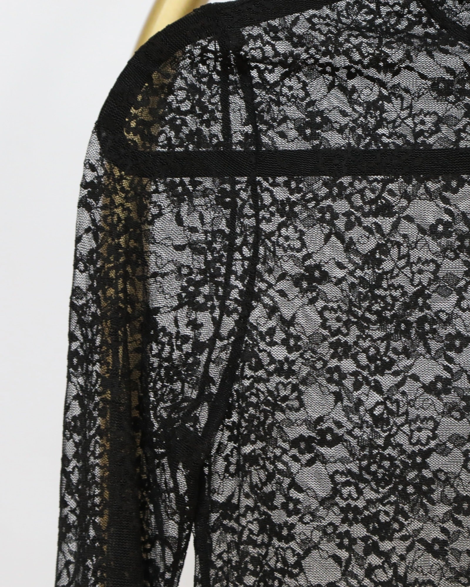 A refined layering piece crafted in delicate black lace. This sheer long sleeve top features a slim, fitted silhouette with a high neckline and subtle seam detailing through the bodice. Lightweight and softly transparent, it’s designed to be worn over a bralette or layered under jackets and dresses for an elevated day-to-night look.