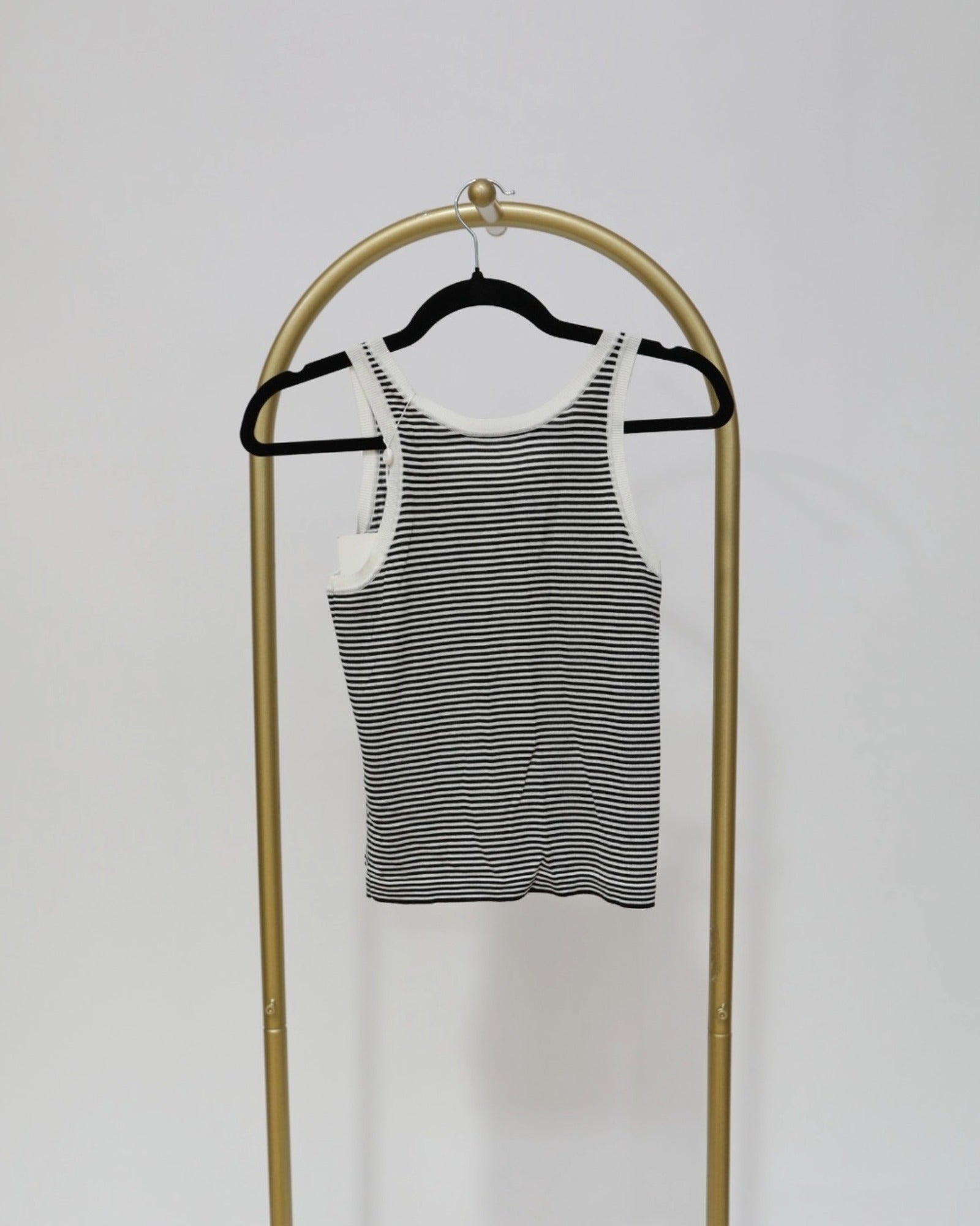 A timeless striped tank with a clean, effortless feel. Designed in a soft ribbed material, this sleeveless style features a flattering scoop neckline, contrast binding, and a classic button-front detail. Easy to wear on its own or layered, it’s the kind of everyday essential you’ll reach for season after season.